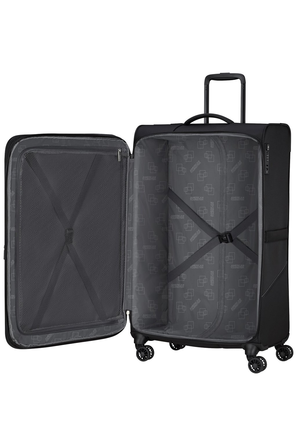 Novinka American Tourister nabízí vše i pro náročnější cestovatele. Uvnitř nalezneme velkou síťovanou kapsu a křížové fixační popruhy v obou částech. Velkým přínosem jsou dvě kapsy na přední stěně kufru. Hlavním bonusem je expandér který vám zvětší objem o 4 litry.